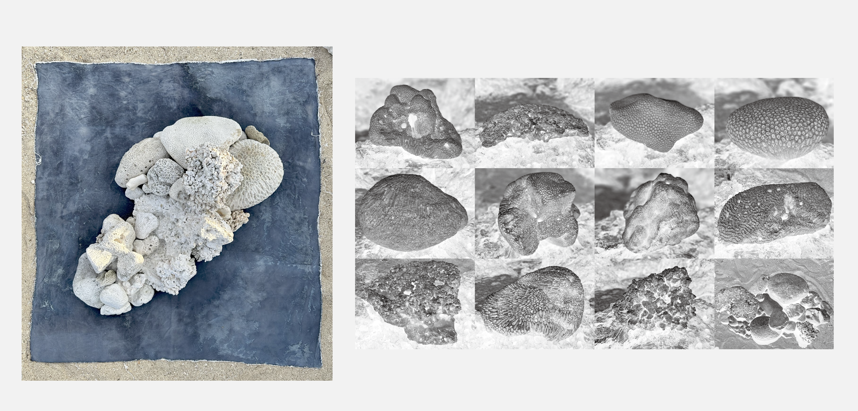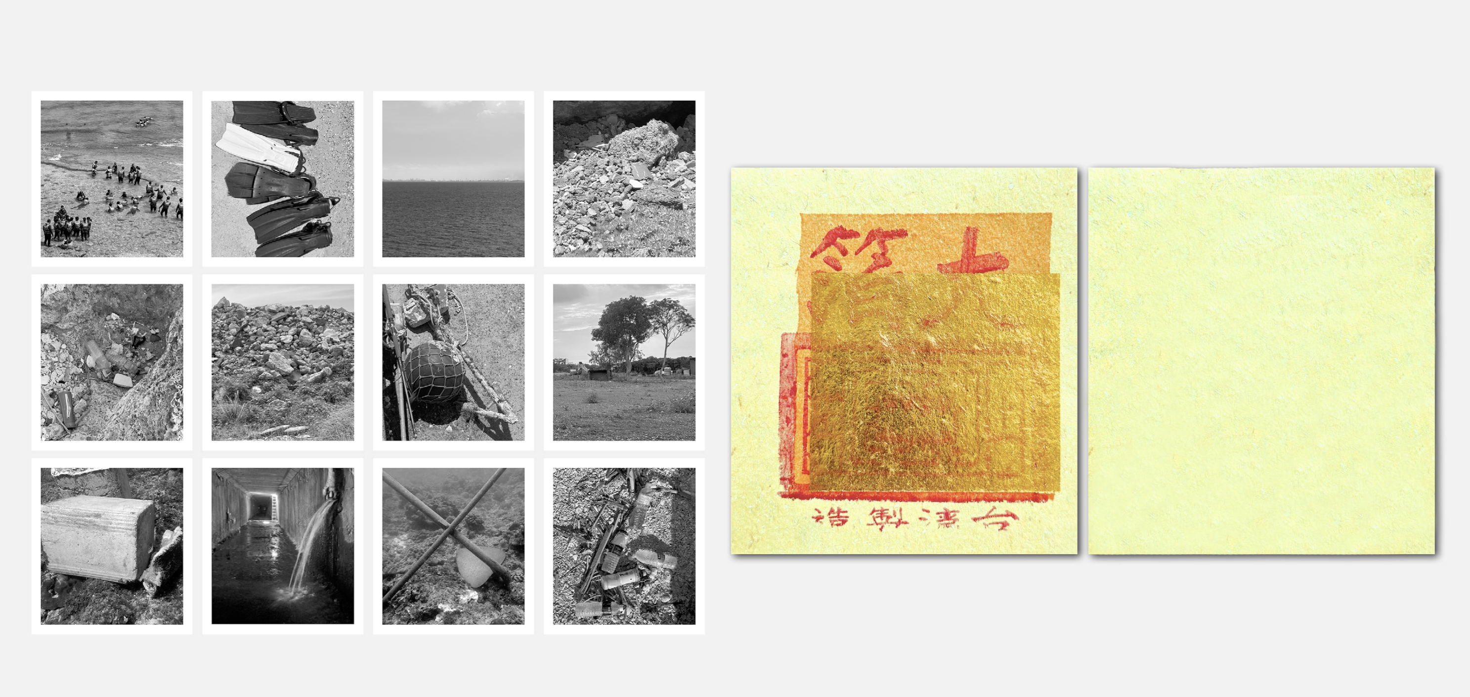 《在他者出生之地,談論自身死亡》是一件結合兩個部分的藝術作品,旨在呈現自然中的矛盾與誤解,以及我個人對此的回應。首先,我運用藍曬的特性,利用在沙灘上找到的珊瑚外骨骼構成的珊瑚石作為底層。透過拼湊這些珊瑚石,形成了小琉球島嶼的輪廓,同時藉著藍曬喚起我對小琉球及其周圍珊瑚白化死亡的思索和聯想。其次,我走訪小琉球的海岸線,拍攝各種影響珊瑚生長的因素並蒐集相關新聞圖像。將這些影像印製在金紙上,並將它們放置在藍曬地圖上相對應的位置。這樣的呈現是我試圖透過與神明和自然界的對話,祈求減緩珊瑚消逝的速度。最後,我將藍曬作品和金紙放置在形似海龜築巢的沙坑上,期待著將人們的關注從海龜的保育轉向珊瑚的死亡議題。