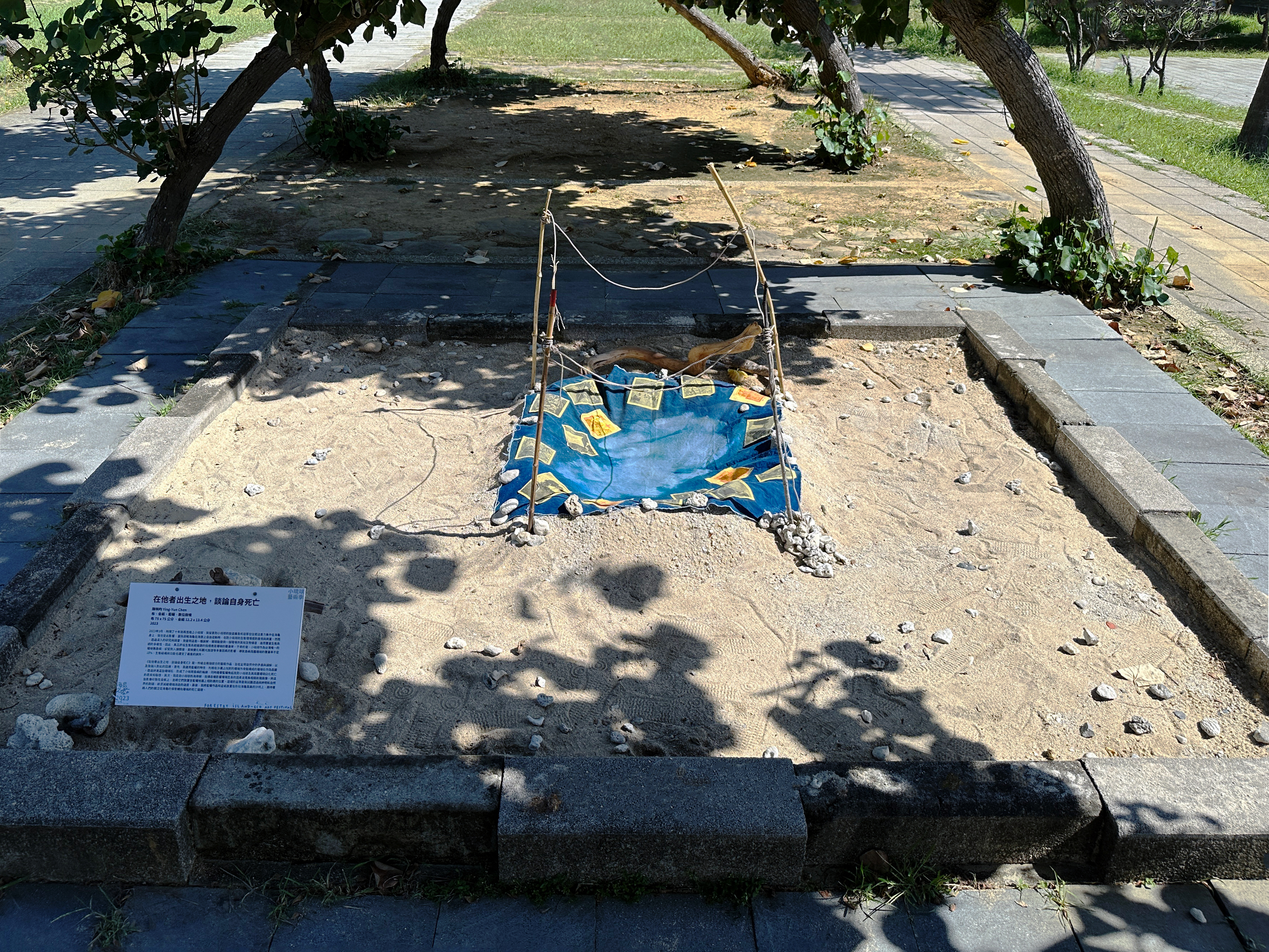 “In the Birthplaces of Others, Discussing Our Own Deaths” is an artwork that merges two disparate elements, with the intent of illuminating some of the conflicts and misunderstandings inherent in humanity’s role in the natural world, while also presenting my own reactions to these issues. I began by taking advantage of the unique characteristics of cyanotypes, using fossilized pieces of corals’ skeletal forms to create a base layer. I arranged this layer of fossilized corals in the shape of Xiaoliuqiu, using the cyanotype process to create a photogram that evokes my thoughts on Xiaoliuiqiu, coral bleaching, and coral reef die-offs. Next, I explored Xiaoliuqiu’s coastline first hand, photographing various factors affecting coral’s growth and development; at the same time, I gathered related images from the news media. I printed these images on joss paper (also known as “ghost money” or “ancestor money”), and then arranged them on the cyanotype photogram in their corresponding locations around Xiaoliuqiu. This approach displays my attempt to pray for a slowing of the pace of coral reef die-offs by creating a dialogue between divine spirits and the natural world. Finally, I placed the cyanotype and the photographs printed on joss paper into a sandbox in which I created a model sea turtle nest. My aspiration is that this installation will draw people’s attention from protecting sea turtles towards protecting the entire coral reef environment.